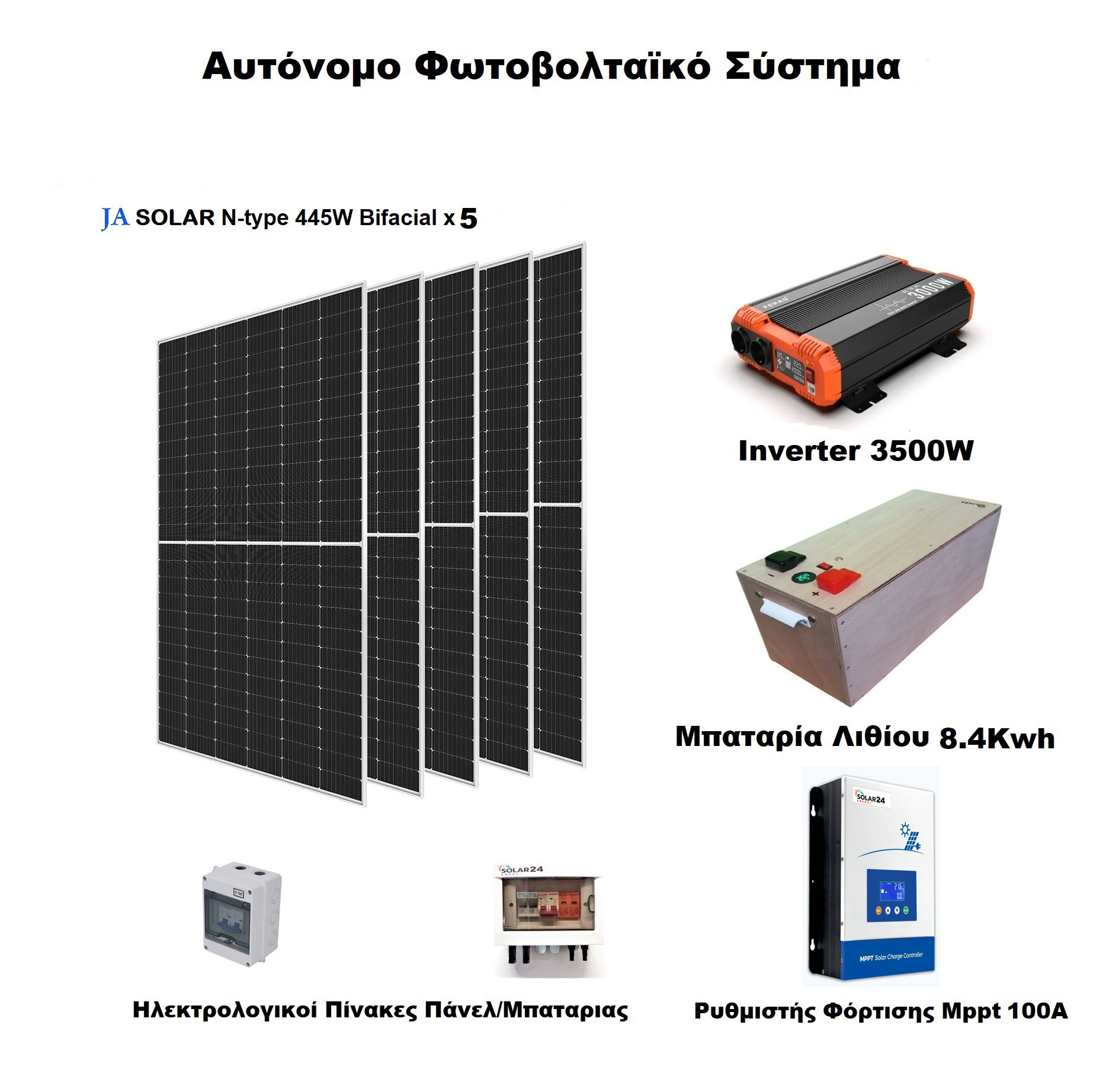 Αυτόνομο Φωτοβολταϊκό Σύστημα 24V Το σύστημα περιλαμβάνει: Φωτοβολταϊκά πάνελ 445W x 5 τεμάχια. Ρυθμιστής φόρτισης Mppt 100A. Μπαταρίας λιθίου Lifepo4 8.4Kwh 25.6V. Inverter καθαρού ημιτόνου 3500W. Ηλ.Πινακες πάνελ και μπαταρίας. Το σύστημα σηκώνει: Ψυγείο A+/24ωρο,Τηλεόραση LED 40" εως 6ώρες/ημέρα,Πλυντήριο ρούχων A+ εως 3ώρες/ημέρα,Κλιματιστικό A+ εως 4ώρες/ημέρα,Φωτισμό LED,Laptop 2 ώρες/ημέρα, Τηλέφωνο/Router 24 ώρες, Φόρτιση κινητού/tablet κ.λ